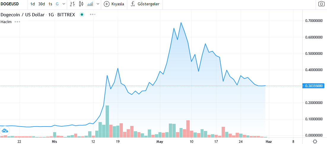 DOGE, 24 saatte yaklaşık %2 oranında değer kaybı yaşadı. Son bir saatte yüzde 2 oranında kazanç sağlayan kripto paranın değeri 0,30 dolar civarında seyrediyor.