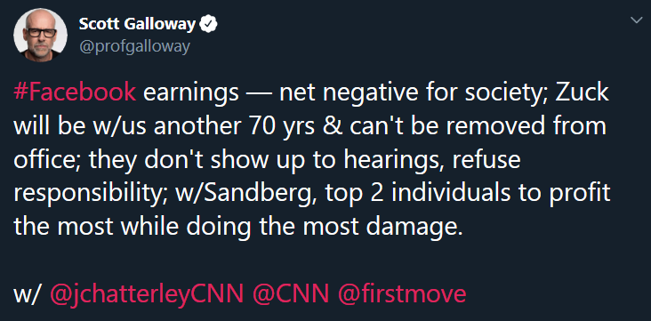 "Facebook kazançları - toplum için net olarak negatif; Zuck bir 70 yıl daha bizimle birlikte olacak ve ofisinden kaldırmamız da mümkün değil; duruşmalara gelmiyor, sorumluluklarını reddedediyor; Sandberg ile birlikte en çok zararı verirken en çok kâr eden ilk 2 kişiden birisi."