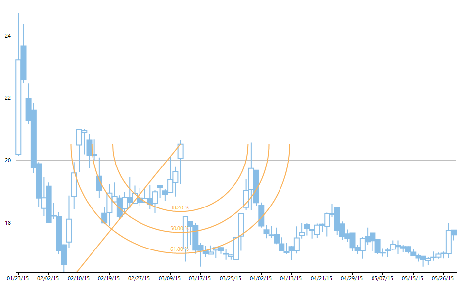 Bir grafiğin en yüksek ve en düşük seviyesini bulmak, Fibonacci yaylarının oluşturulmasında ilk adımdır. Daha sonra, pusula benzeri bir hareketle, istenen noktadan % 38.2, % 50 ve %61.8'de 3 eğri çizgi çizilir. Bu çizgiler, değişen alanların yanı sıra destek ve direnç seviyelerini de öngörmektedir.