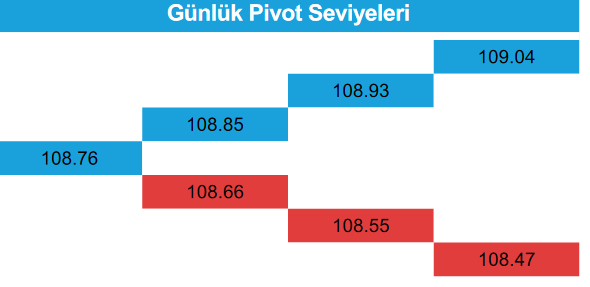 Yükselişin devam etmesi halinde 109,00 – 109,32 ve109,60 direnç olarak izlenebilir. Geri çekilmelerde ise 108,28 –108,00 ve 107,75 seviyeleri destek olarak takip edilebilir.