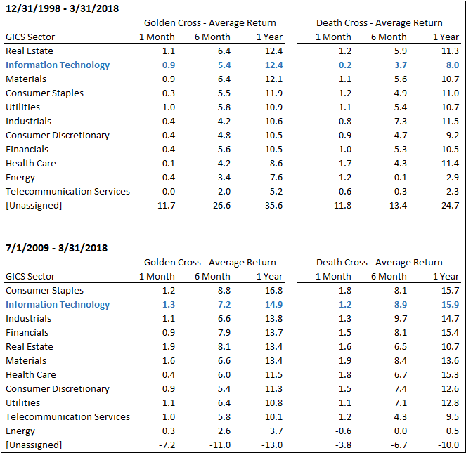 Factset, death ve golden cross göstergelerinin tatihsel verilerinin şirketler ve sektörler arasında nasıl bir performans sergilediği konusunda bir çalışma yapmış. Kullandıkları veriler, ABD'de bulunan şirketleri içeriyor ve bu şirketlerin değeri en az 300 milyon dolar değerinde. Bu şirketler için, iki resesyon ve iki boğa piyasası yakalamak adına 31 Aralık 1998 - 31 Mart 2018 arasındaki tüm cross göstergelerini incelemişler. Bunu yaparken güvenilirliği artırmak maksadıyla her bir cross göstergesinden başlayarak sektörleri 6 aylık ve 1 yıllık olmak üzere ayırmışlar. Bu zaman aralıklarına bölerken 20 yıllık performans verileri boğa rallisi görülen 1 Temmuz 2009 - 31 Mart 2018 arasındaki getirilerle karşılaştırmışlar. Tabloda görebilirsiniz: