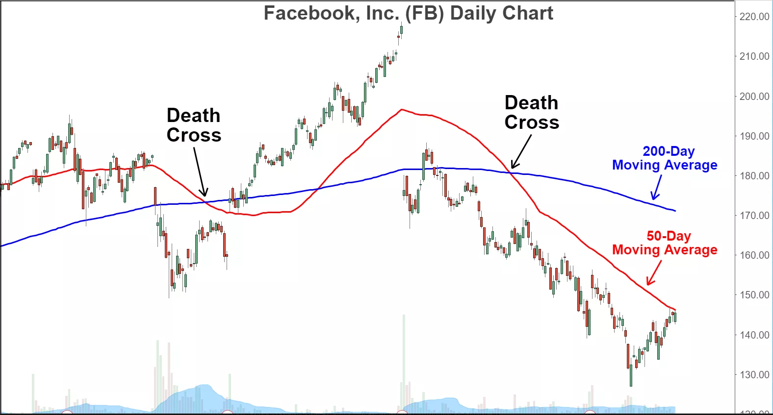 Aşağıda, 2018'de Facebook Inc. (FB) hisse senedi için meydana gelen iki death cross göstergesinin örneği bulunuyor. Grafikte görülen 1. death cross trendde görülen bir dönüşü ve ralliyi gösterirken 2. death cross hisse senedi için uzun bir ayı piyasasına işaret ediyor. [1]