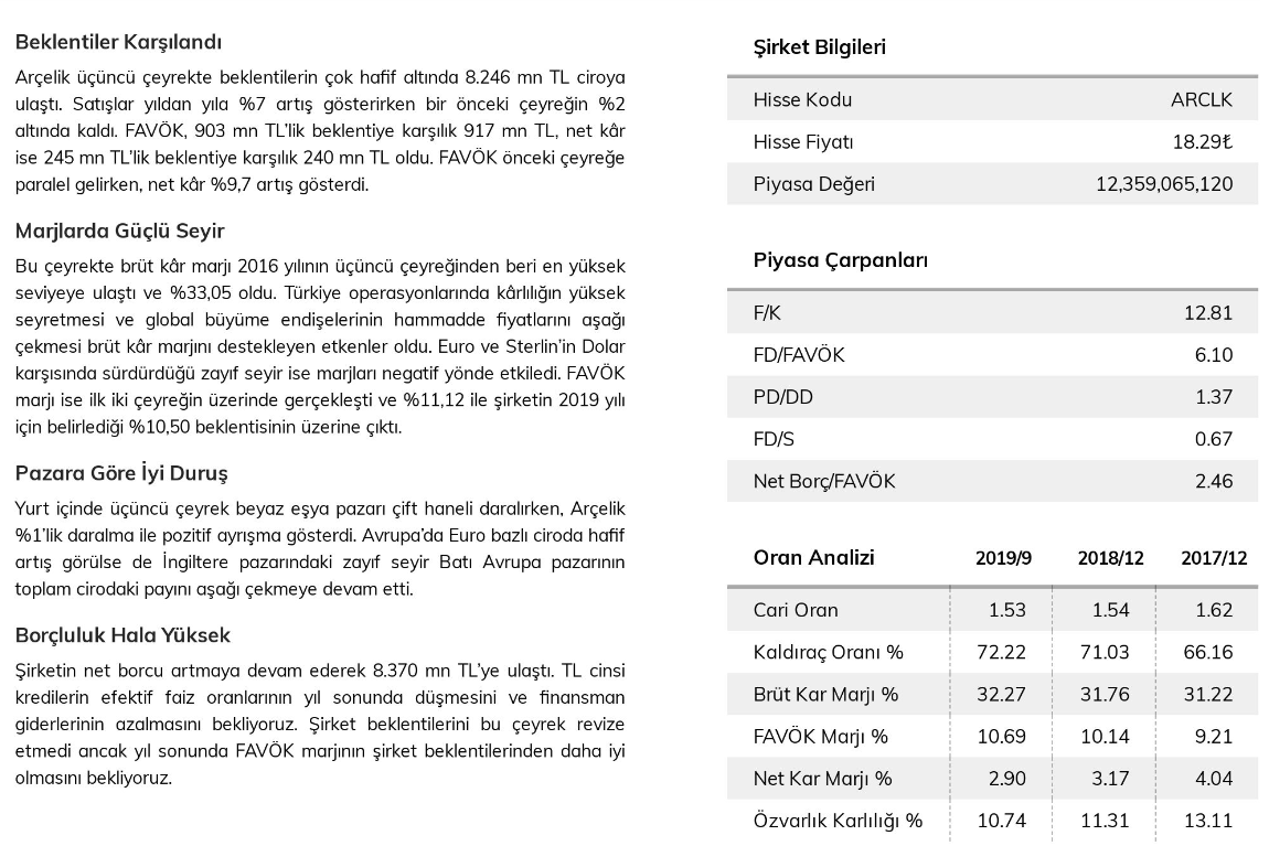 INFO YATIRIM - ARCLK DEĞERLENDİRME RAPORU - 31.10.2019