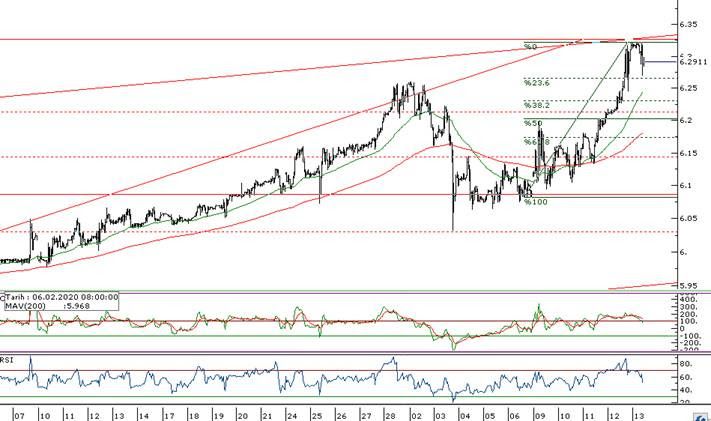- Kısa vadeli fibonacci düzeltme seviyelerine baktığımızda #,6 seviyesi 6,27 seviyesini gösterirken %38,2 düzeltme seviyesi 6,25 seviyesine denk gelmektedir. Özellikle 6,25 destek seviyesi kırılması durumunda 6,21 seviyesi en kritik destek seviyesi olarak karşımıza çıkacaktır.