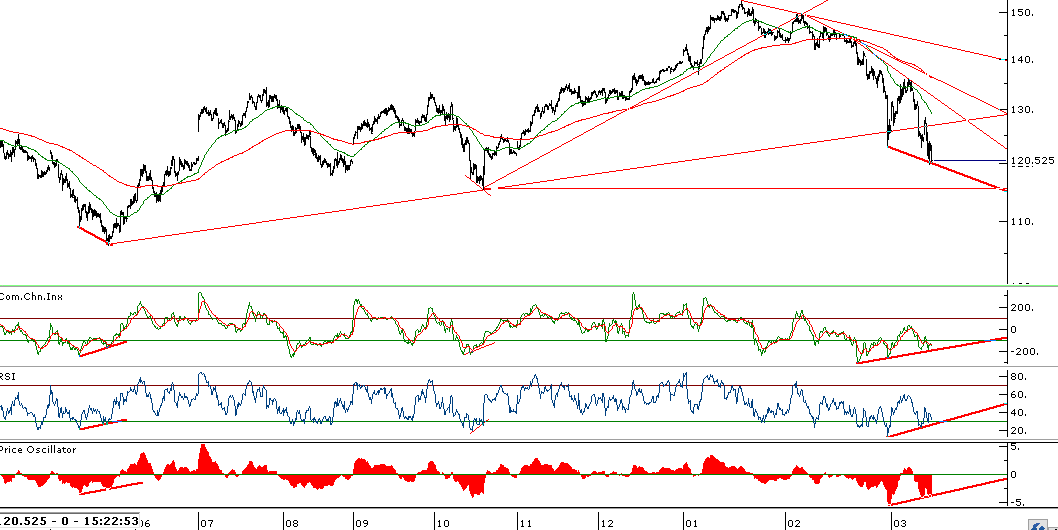 - Endeks kontratı 120 dakikalık grafiğinde 123.000 ve 120.000’de oluşan dip oluşumlarında RSI, CCI ve Price OSC. İndikatörlerinde grafikte görüldüğü gibi oluşan pozitif uyumsuzluk 120.000’in altında oluşacak dip oluşumu tamamlandığında tepki yükselişini gündeme getirebilir.