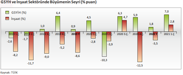 Türkiye inşaat sektörü, 2021 yılı ilk çeyrekte %2,8 oranında büyüme kaydetti. Raporda, sürdürülebilir büyüme için "inşaat yatırımlarının hızlanması, sektör üzerindeki girdi maliyetleri baskısının ve vergi yükünün azalması" gerektiğine işaret ediliyor.