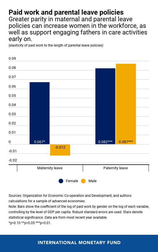 Bununla birlikte anne ve ebeveyn izni politikalarındaki iyileştirmeler kadınların işe dönüşlerini hızlandırır ve babaların da erken dönemde çocuk bakım faaliyetlerine katkıda bulunarak kadınların işgücüne katılımını yükseltir.