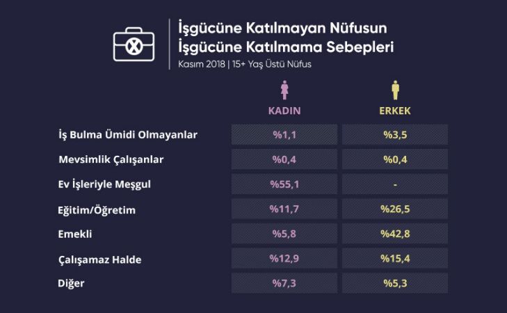Temmuz 2019 verilerine göre de işgücüne katılım oranı kadınlar için %34,5, erkekler için %71,8'dir.