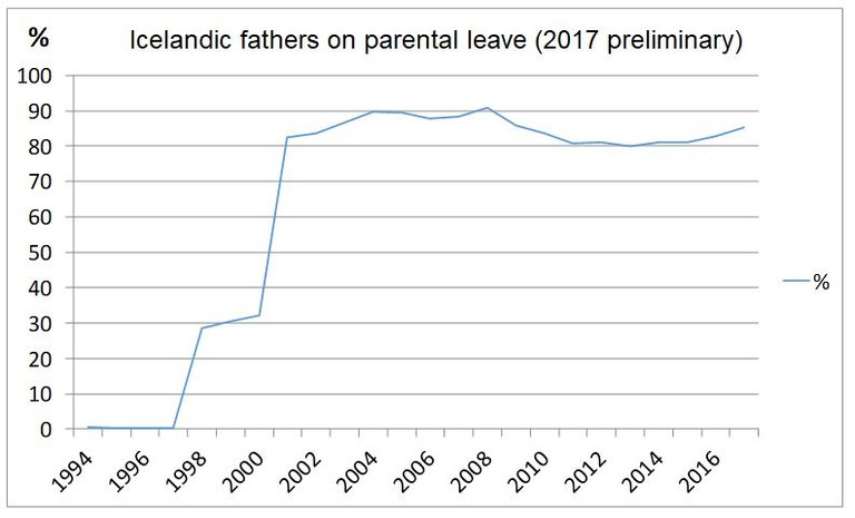 İzlanda’nın yeni ebeveyn izni yasası 2000 yılında yürürlüğe girdi. Ebeveynler arasında dokuz aylık izin paylaşılıyordu: üç ay anne, üç ay baba ve üç ay da ikisi arasında. Ebeveynler izinlerini tam olarak nasıl organize edeceklerine karar vermekte özgürler. İzlanda’nın yeni sistemi, uygulandığında büyük ses getirdi.