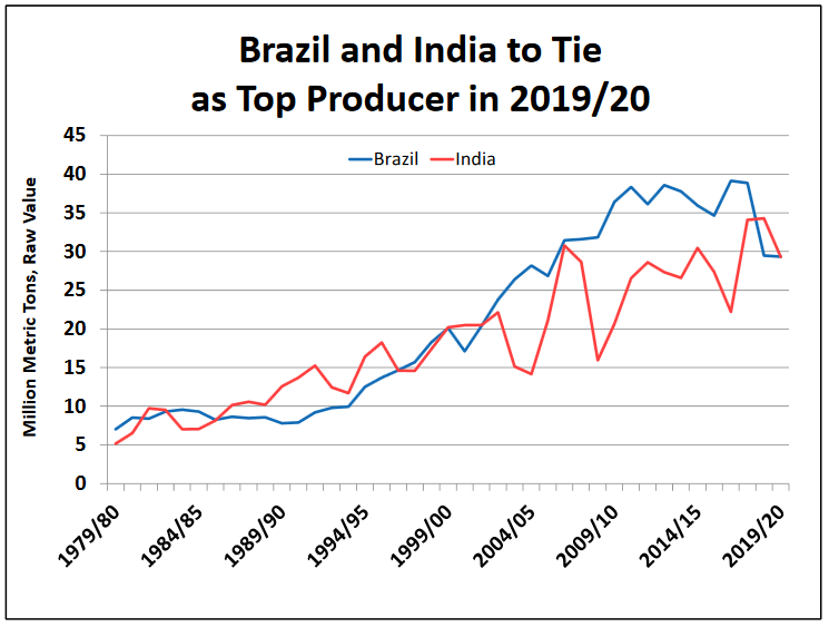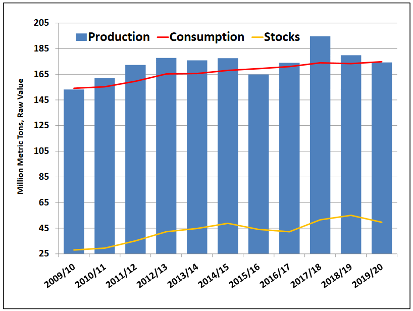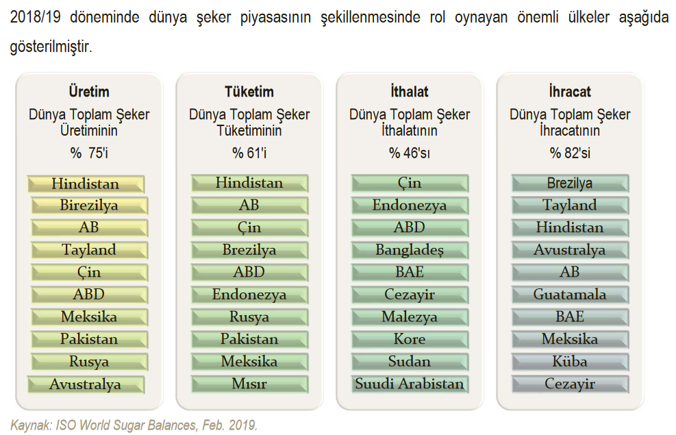 2019/20 için küresel şeker üretiminin, esas olarak daha az alan ve düşük verim nedenleriyle Hindistan'daki 5 milyon tonluk azalma sonrasında 174 milyona düşeceği tahmin ediliyor. Brezilya ve Hindistan esasen en iyi üreticiler olarak biliniyor. Hindistan'da rekor şeker kullanım sebebiyle tüketimin hızla artmaya devam etmesi bekleniyor.