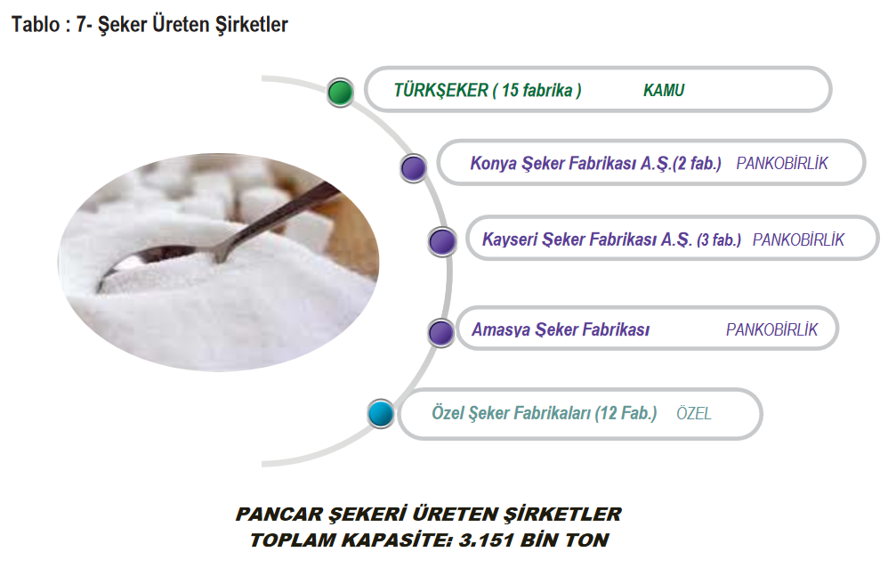 Türkiye’de halihazırda; 3 milyon 151 bin tonu pancar şekeri, 990 bin tonu nişasta bazlı şeker olmak üzere toplam 4 milyon 141 bin ton şeker üretim kapasitesi mevcuttur. Pancardan şeker üreten şirketlerin toplam günlük pancar işleme kapasitesi ise 191 bin 500 ton’dur.