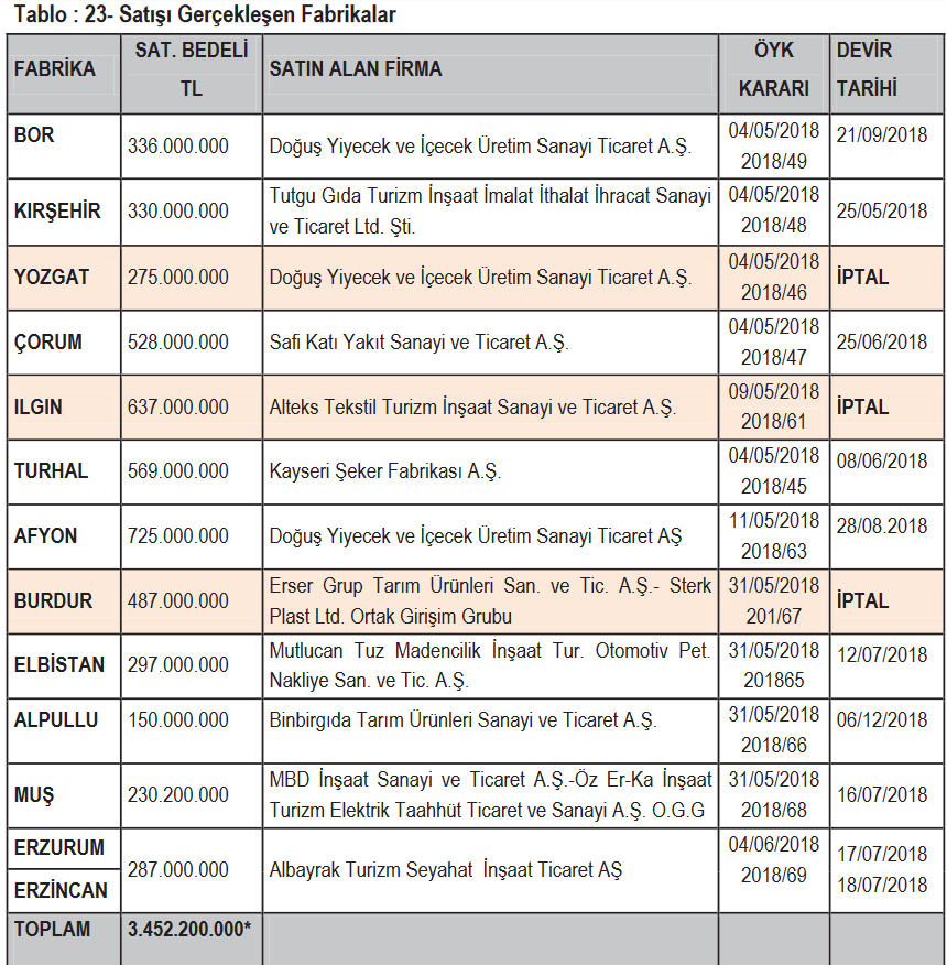 20.02.2018 tarihinde T.C. Başbakanlık Özelleştirme İdaresi Başkanlığı tarafından 14 fabrikanın (Afyon, Alpullu, Bor, Burdur, Çorum, Elbistan, Erzincan, Erzurum, Ilgın, Kastamonu, Kırşehir, Muş, Turhal ve Yozgat Şeker Fabrikaları) özelleştirilmesi için ihale süreci başlatılmıştır. Bu kapsamda Kastamonu Şeker Fabrikası dışında (alıcı çıkmadığı için); Afyon, Alpullu, Bor, Burdur, Çorum, Elbistan, Erzincan, Erzurum, Ilgın, Kırşehir, Muş, Turhal ve Yozgat Şeker Fabrikaları’nın pazarlık görüşmeleri tamamlanmış, satışlara ilişkin ÖYK kararları çıkmıştır. Bu fabrikalardan 10 adedinin (Afyon, Alpullu, Bor, Çorum, Elbistan, Erzincan, Erzurum, Kırşehir, Muş, Turhal) devir işlemleri tamamlanmış,Burdur, Yozgat ve Ilgın Şeker fabrikalarının satışı ise 25.12.2018 tarihli ve 505 sayılı Cumhurbaşkanlığı kararı ile iptal edilmiştir.