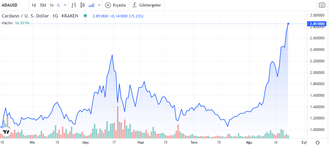 Yükselişiyle en çok dikkat çeken altcoin Cardano (ADA) oldu. ADA, 24 saatte %8,3 oranında değer kazanarak 2,87 dolara çıktı ve böylece tüm zamanların en yüksek seviyesine ulaşmış oldu. Piyasa değeri 91 milyar doları aşan ADA, piyasa değeriyle Binance Coin'i geçerek 3. sıraya yerleşti.