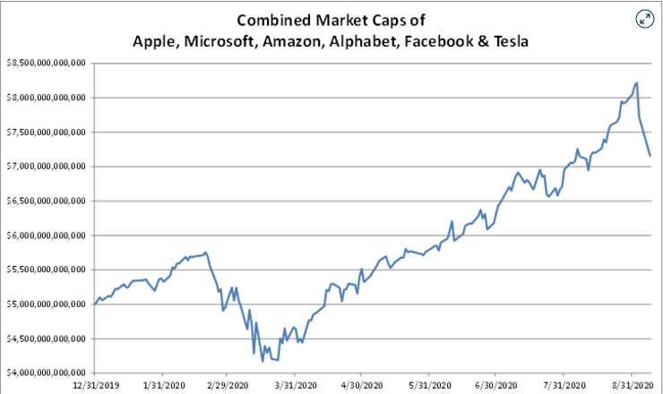 2020'nin başında, en büyük altı teknoloji şirketi yaklaşık 5 trilyon dolar değerindeydi. 2 Eylül Çarşamba günü ise 8,2 trilyon dolar değeriyle zirveye ulaştılar. Salı günü kapanıştan sonra 7,1 trilyon dolarlık piyasa değerine sahiptiler. Birkaç gün içinde büyük bir kayıp görülmüş olsa da bu 6 şirket, küresel çapta yaşanan koronavirüs salgınına ve ABD'deki rekor işsizlik rakamlarına rağmen 2,1 trilyon ABD doları değerinde.