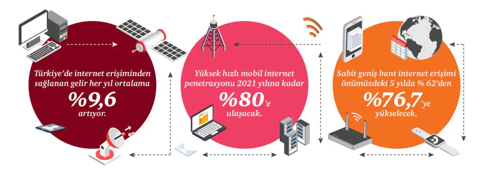 "Mobil internet gelirinin büyümeye öncülük etmesi ve 2021'e kadar %11,3 YBBO ile 3,4 milyar dolar gelire ulaşmasının beklentisiyle, Türkiye'deki toplam internet erişimi gelirleri %9,6 YBBO ile 2021'de 5,6 milyar dolara erişecek. Mobil internet kullanımı %48,5'ten %72,9'a hızla çıkacak. 2021'in sonuna doğru yüksek hızlı mobil internet piyasaya %79,8 oranında girmiş olacak; 2016'dan bu yana %10,2'lik büyük bir artış yaşanmış anlamına geliyor.