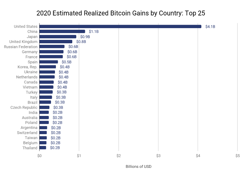Analiz şirketi Chainalysis verilerine göre Bitcoin kazancı en yüksek ülke ABD oldu. ABD 4.1 milyar dolar değerindeki kazancı ile diğer ülkelere açık ara fark attı. İlk 5'te bulunan ülkeler;