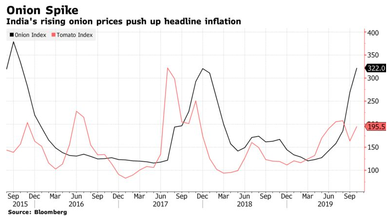 Soğan fiyatındaki ani yükselişin geçtiğimiz yıllarda sosyal huzursuzluğa yol açtığı Hindistan'da, sebze fiyatlarında görülen yıllık %26'lık bir artış, Ekim ayındaki enflasyonu 15 ay içinde ilk kez %4 olan Rezerv Bankası eşiğinin üzerine çıkarmıştı.