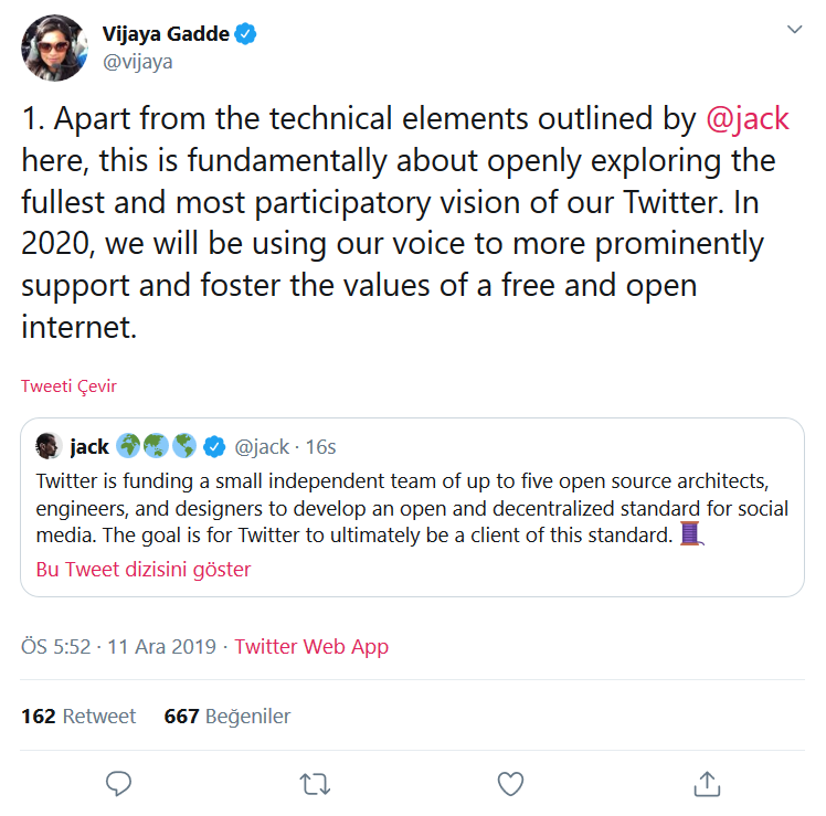 Twitter'da politika ve güvenlik lideri konumunda olan Vijaya Gadde, "2020'de, özgür ve açık bir internetin değerini daha belirgin bir şekilde desteklemek ve güçlendirmek için sesimizi duyuracağız" dedi.