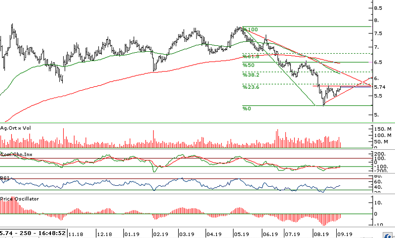 - Hissede kısa vadeli yükselen üçgen formasyonu var, 5,77 direnci kırılması durumunda 6,00 ve 6,20 fiyat seviyelerinin ilk aşamada görülmesini bekliyoruz.
