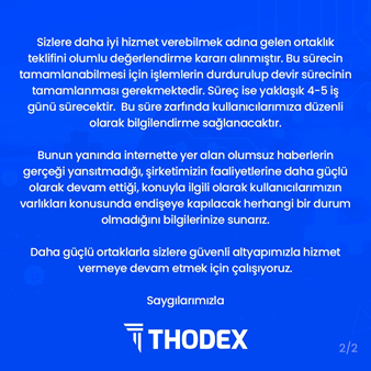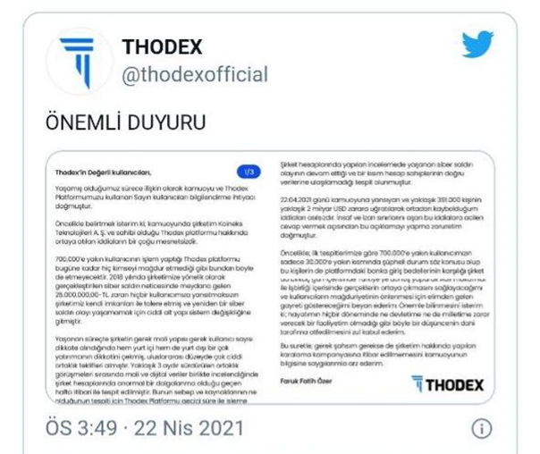 Yurtdışına çıktıktan sonra Thodex Kurucusu ve CEO Faruk Fatih Özer, 22 Nisan’daborsanın web sitesi ve Twitter üzerinden kullanıcılara yönelik bir mektup paylaştı. Mektupta Özer, Thodex'in birkaç yıl önce hack’lendiği ve sonrasında kullanıcılarına ödeme yapmak için borçlandığı, kripto paraların yüksek oranlarda değer kazanmasıyla birlikte ise bu borçları ödeyemez hale geldiğini belirtti. Açıklamaların altında imzası da bulunan Faruk Fatih Özer, kısa süre içinde kullanıcıların paralarını belli bir oranda alabileceğini; ayrıca Türkiye'de kalıp tutuklanmaktansa yurt dışında çalışıp insanlara borçlarının geri kalanını ödemek istediğini söyledi.