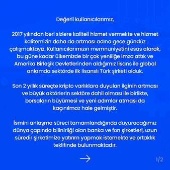 21 Nisan sabahı yapılan duyuruda ise, şirkete dünya çapında bilinirliği olan banka ve fon şirketlerinin ortak olarak girmek istediklerinin ve borsanın web sitesinin de 4-5 iş günü sürecek devir işlemleri süresince kapalı kalacağı bildirildi. Açıklamada ayrıca "Olumsuz haberlerin gerçeği yansıtmadığı, şirketimizin faaliyetlerine daha güçlü olarak devam ettiği, konuyla ilgili olarak kullanıcılarımızın varlıkları konusunda endişeye kapılacak herhangi bir durum olmadığını bilgilerinize sunarız. Daha güçlü ortaklarla sizlere güvenli altyapımızla hizmet vermeye devam etmeye çalışıyoruz.” ifadelerine yer verildi.