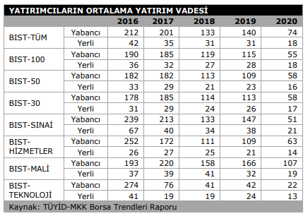 Türkiye Sermaye Piyasası Kurulunun (SPK) mayıs ayına ait raporunda yerli ve yabancı yatırımcıların ortalama hisse senedi tutma sürelerine yer verildi. Rapora göre, yerli yatırımcıların hisse tutma süresinde diğer yıllara kıyasla 2020 yılında belirgin bir gerileme görüldü.